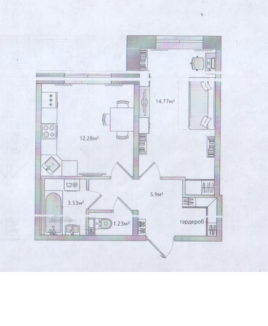 Общая площадь 39.62 кв.м площадь комнат 14.77 кв.м.