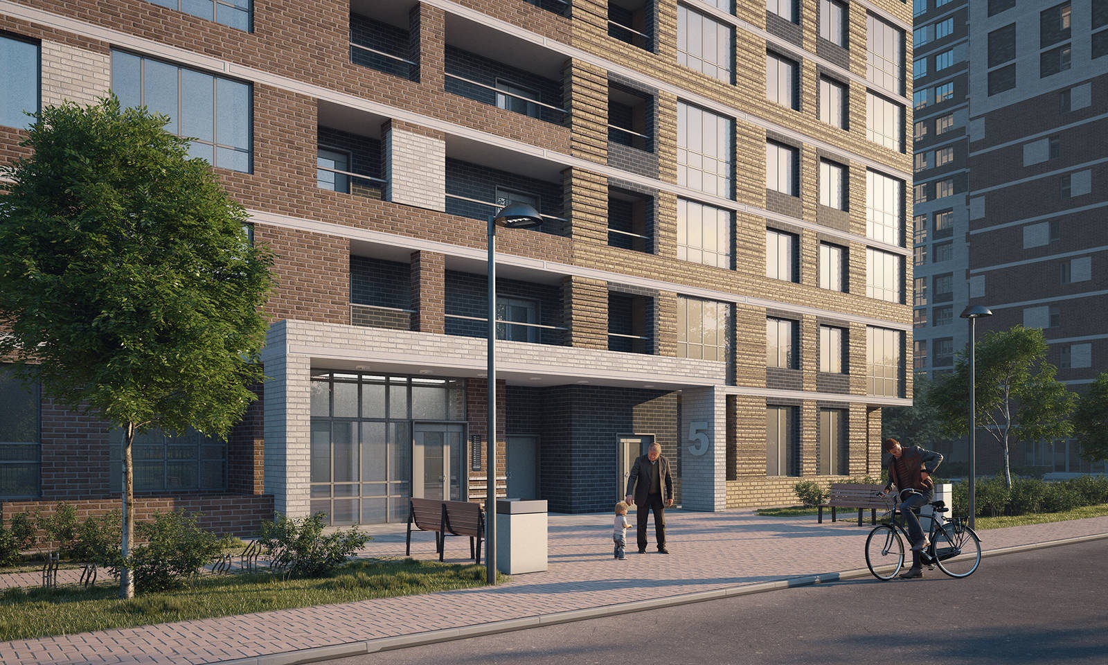 Вход в подъезды осуществляется с уровня земли, без ступеней, что обеспечивает комфорт для жителей дома, особенно для семей с маленькими детьми.